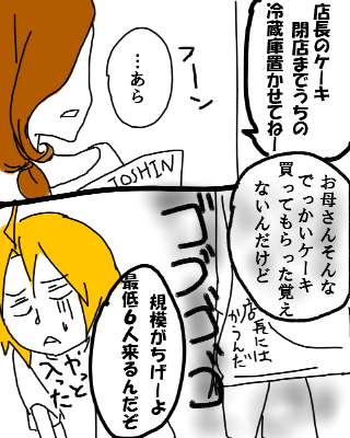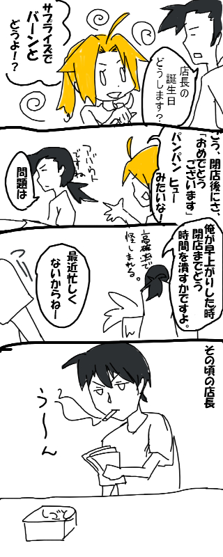 んで、そのまま営業に入る我々 S君の行動が不審過ぎて一発でわかっちゃう店長 まあ不審と一言で言っても、そういう点はいくらかあったようで 雨で客が来なかったので、普段より早い時間に上がるS君 しかも閉店前に他店の店長がプリン持って来て「おめでとうございますー」・・・。先越された上にサプライズになってないっていう。
